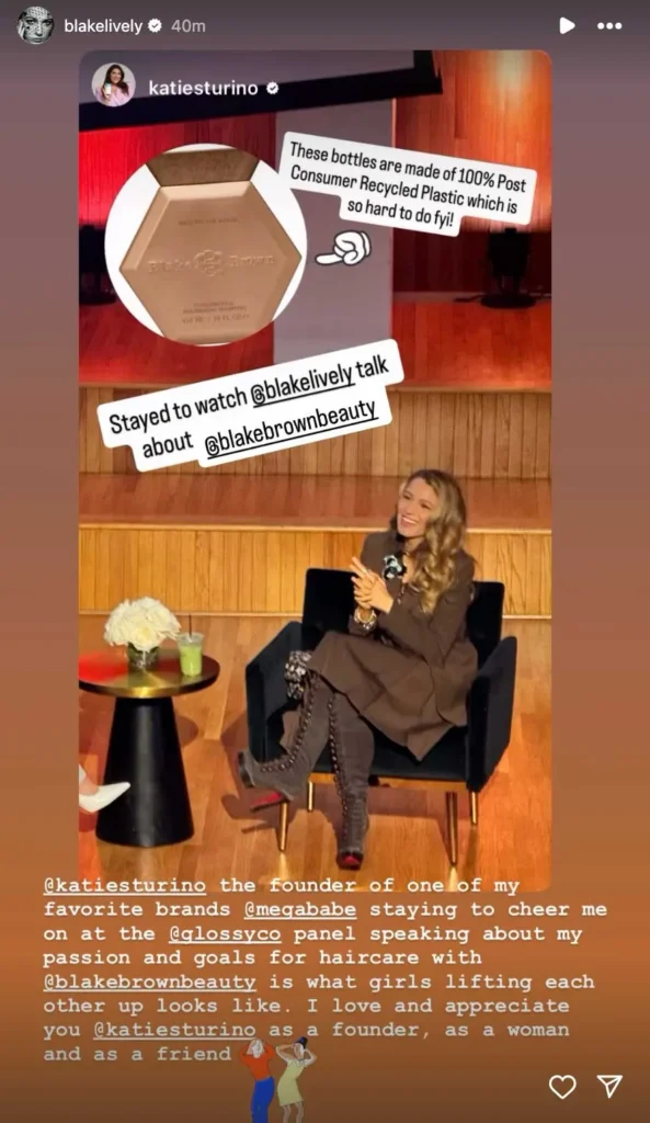 The event, held at FIT’s Katie Murphy Amphitheater, spotlighted “Reimagining Premium Haircare: From Accessibility to Routine,” featuring Lively’s own passion project—her beauty and haircare brand, Blake Brown, which launched earlier this year. On Instagram, the actress gave a heartfelt nod to friend and Megababe founder Katie Sturino, who attended in support. “This is what girls lifting each other up looks like,” Lively wrote, praising Sturino as both a founder and a friend.
