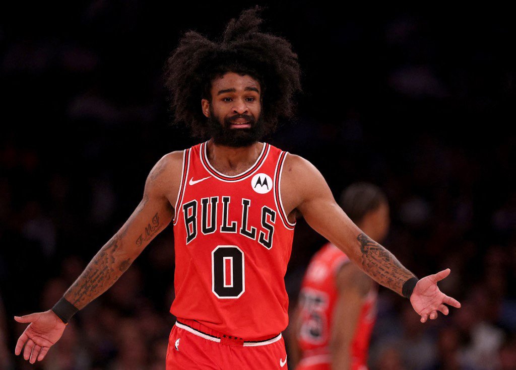 NEW YORK, NEW YORK – JANUARY 03: Coby White #0 of the Chicago Bulls reacts to a call against the Chicago Bulls during the first half against the New York Knicks at Madison Square Garden on January 03, 2024 in New York City. NOTE TO USER: User expressly acknowledges and agrees that, by downloading and or using this photograph, User is consenting to the terms and conditions of the Getty Images License Agreement. Elsa/Getty Images/AFP (Photo by ELSA / GETTY IMAGES NORTH AMERICA / Getty Images via AFP)