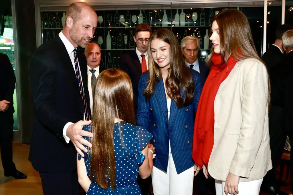 Prince William, attending in his official capacity as President of the Football Association, brought along his 10-year-old daughter, Princess Charlotte, who made her first public appearance at a Lionesses match. Prior to kick-off, the duo met Princess Leonor, 19, and Princess Sofia, 18 — the daughters of King Felipe VI and Queen Letizia of Spain.